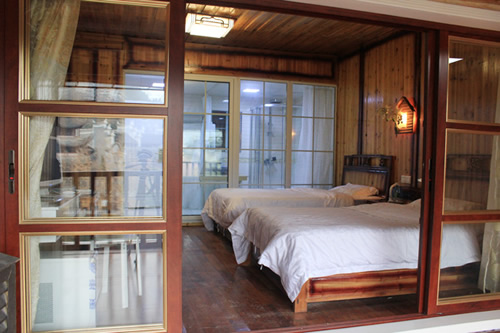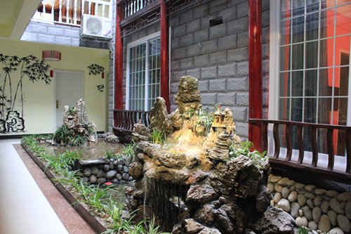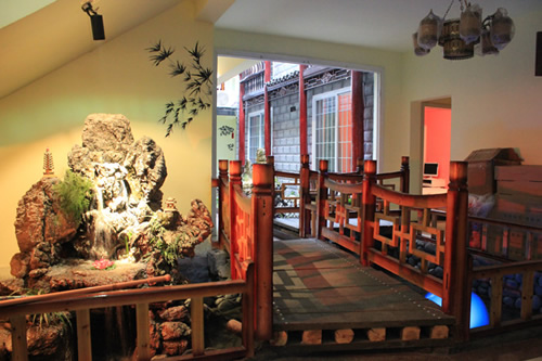 古樸的客房內(nèi),超大陽臺全景落地窗,是您欣賞沱江風(fēng)光帶首選客棧,兩座百年四合院內(nèi)小橋流水,假山錦鯉,一百三十平米休閑花園別具情調(diào)。紅酒加咖啡的大堂吧、彩色精致的情調(diào)房、古典高雅的臨江觀景房以及大型公共觀景平臺,龍閣的點(diǎn)點(diǎn)滴滴都透著出古城的神韻和幽靜,走進(jìn)龍閣客棧,給您一個(gè)完美的鳳凰古城沱江全景!