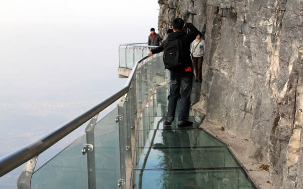 玻璃棧道是張家界天門山景區(qū)繼懸于峭壁之上的鬼谷棧道、憑空伸出的玻璃眺望臺(tái)、橫跨峽谷的木質(zhì)吊橋后打造的又一試膽新景點(diǎn)。這條看著就讓人腿軟的玻璃橋給人帶來(lái)的刺激震撼感可與舉世聞名的美國(guó)大峽谷玻璃走廊“天空之路”媲美。