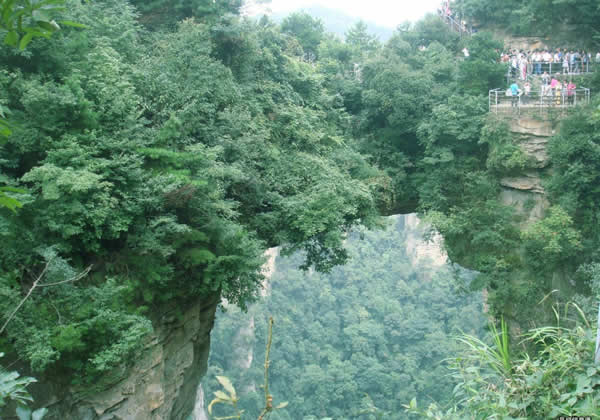 在砂刀溝盡頭右側(cè),袁家界左面南沿,一天然石橋凌空飛駕于兩座巨大的石峰之巔,厚約4米,寬2米余,跨度約50米,相對高度400多米。橋面兩端石峰上,綠樹叢簇,郁郁蔥蔥,峰壁則宛若斧劈,草木不生。立橋邊俯視,透過稀疏樹葉,見云涌霧蒸,幽深莫測。自北端步行過橋,狹窄處僅數(shù)十厘米,心驚卻步。繞過深谷,站在相距40多米處觀橋臺上,橋的全貌映入眼簾,橋身雄奇?zhèn)グ丁?