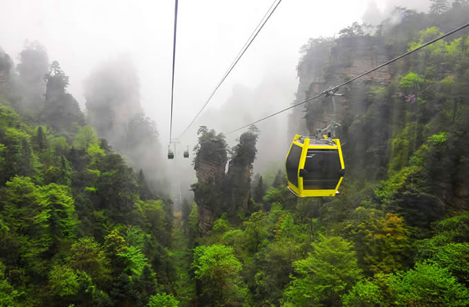 楊家界風(fēng)光 楊家界索道是世界自然遺產(chǎn)武陵源風(fēng)景名勝區(qū)繼天子山索道、黃石寨索道后的第三條客運索道,上站位于八里坡游覽線劉家檐,下站位于中湖鄉(xiāng)野溪鋪村。該索道采用法國玻瑪索道設(shè)備,是世界頂級雙回路循環(huán)式配置八人車廂式索道,全長1876米,上下站垂直高差517米,線路支架14個,最高運行速度6m/s,最大運力為2300人/小時,單程運行時間5.2分鐘,是目前國際最先進(jìn)的客運索道。