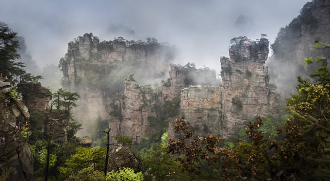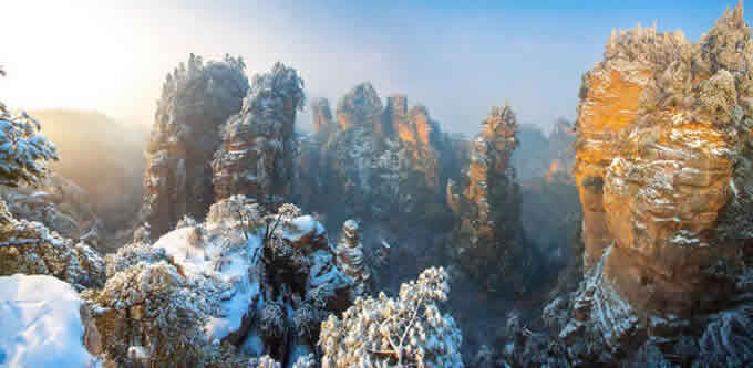 楊家界雪景 作為世界自然遺產(chǎn)武陵源四大核心景區(qū)之一的楊家界景區(qū),地勢險要,風(fēng)景絕美,跟張家界、天子山、索溪峪比較,其中的地質(zhì)地貌一部分相同外,又有其獨特的資源優(yōu)勢,擁有全球罕見的峰墻群奇光。乘坐在舒適的楊家界索道里,可以盡情體驗“會當(dāng)凌絕頂,一覽眾山小”的居高臨下與動感,360度暢游夢想般的楊家界仙界,俯瞰“近在咫尺”的千山萬壑,山舞銀蛇,千嬌百媚的絕美“峰墻”盡收眼底,無限風(fēng)光在險峰,數(shù)十道氣勢如虹的石墻,一排排層巒疊嶂,相對平行而立,高矮參差不齊,宛如“天然長城”,真是美輪美奐,絕景天賜,不得不讓人驚嘆大自然的璧山開地之功。