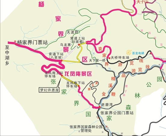 龍泉瀑布-楊家界風(fēng)光 3、中湖門票站進(jìn) 中湖門票站——索道下站八里坡停車場:(乘車)15分鐘 楊家界索道運行時間5分鐘 索道上站——劉家檐停車場:(步行)5分鐘 劉家檐停車場——袁家界天橋停車場(乘車)10分鐘 劉家檐停車場——天子山停車場(乘車)25分鐘