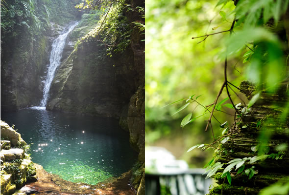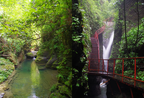 十八潭總名。稍作休憩,我們開始奔赴東線的景點。東線主要是以十八潭為主,下游有4潭:合潭、梳妝潭、魚潭、黑潭;中游有9潭:換衣潭、美人潭、石蛙潭、姊妹潭(3個)、情侶潭(2個)、二龍搶珠,上游有5潭:鬼谷神功(2個)、幽潭、落銀潭(彩虹潭)、路邊潭。十八個潭深淺不一,淺則1米以上,深則4米左右,形狀各異,有的月牙形,有的豬腰狀,形狀不規(guī)則,石壁上水沖成潭,真是鬼谷神功,此處水質細膩,加之綠林映襯,水色碧綠見底,猶如十八顆翡翠石鑲嵌在山林之間,涓涓溪流晶瑩剔透,飛流直下的瀑布,氣勢磅礴,蔚為壯觀, 下游的4潭,合潭、梳妝潭、魚潭、黑潭。合潭是仙女峽谷與十八潭的交匯處;梳妝潭的水清如明鏡,又因為潭兩側石頭的封閉,使這面鏡子靜止不動,很方便梳妝,照鏡子。在梳妝潭周圍,有一種植物屬于紅豆杉系列,它的形狀好似梳子,可以用來梳頭。魚潭可不能望文生義。魚潭,是在冬天的時候,所有的魚都聚集在這里過冬,除此之外,這個潭水淺見底,冬天魚苗聚集,是捕魚的好季節(jié)。黑潭,水深不見底,所以叫黑潭。現在已經看不見梳妝潭、魚潭、黑潭了,你猜為什么?建水庫,建水上樂園,淹沒了。 斷魂石的傳說。三國時期,高氏和蕭氏一對夫妻春節(jié)忙活,遇上了天門垮眼,受余震襲擊,打死了丈夫蕭氏。高氏思念丈夫,淚哭不斷,結果摔死潭中。人們經常還能聽到哭聲傳來,不敢單獨行走,需成群結隊。后人為了鎮(zhèn)邪,雕刻一條蜈蚣驅趕哭魂,多年后,蜈蚣成精,天上打雷,巖石發(fā)光,遭雷所劈,成了斷魂石。 和尚姥,也就是丹灶峰,天門十六峰之一。相傳此峰為仙人化身,赤松子曾在此煉丹,許多詩人在此留下了美妙的詩篇,明代葉守禮《丹灶峰》: 懸崖峭壁隔塵寰,上有仙人學煉丹。 煉得丹成鶴已去,獨留丹灶在峰巒。 意思是說,在這險峻秀麗的山峰上,赤松子潛心煉丹,不受塵世干擾,身心沉醉于秀美的山間,沉溺于丹藥的煉制之中。作者很是羨慕那種與世隔絕的超脫,那種執(zhí)著于自我理想的瀟灑,你羨慕不羨慕? 竹林叢生。我們要學習竹子的精神,中空、謙卑;我們要學習竹子的精神,抱團生長;我們要學習竹子的精神,破土而出,節(jié)節(jié)高。 向家塔。打造農耕養(yǎng)生游的地方。種田、種菜、種花,農家餐館。 爛泥巴根。爛泥巴根和馬桑樹是同科,是這里獨特的一種樹。馬桑樹亦稱“千年紅”、“馬鞍子”,屬落葉灌木,馬桑樹多枝叢生,一簇一簇的,枝葉像傘蓋,因此“馬桑樹兒搭燈臺”。春風一吹,滿山的馬桑樹、爛泥巴根就吐翠滴綠,顯示出強勁的生命力。打油詩一首: 青青枝條四方走, 肥肥大葉落上頭, 身在路邊無人問, 冬去春來樂悠悠。 秋天死亡,春天長勢更加茂盛,它的新生是通過死亡實現的。山川如此,植物也是如此,這里的一草一木無不透露著道家那種齊生死、等貴賤的精神。 這叫“常道”亭,“道可道,非常道”,據說是白狐與劉海相遇的地方。吊橋。 十八潭各具特色。 中游有9潭。第五潭叫換衣潭。巖石聳立,霧氣氤氳,巖壁上布滿水汽,猶如雨下。又因過道狹窄,行人需彎腰通過,未免雨水打濕衣裳,在此就要脫下身上衣物,通過后在第六潭再穿上。因此第六潭又叫美人潭,很幽深神秘的。第七潭叫石蛙潭,水淺,又比較平穩(wěn)、安全,春天產籽。余音回響,猶如蛙鳴,給人“聽取蛙聲一片”的錯覺。 對面巖壁叫“臘肉鋪”,那條自上而下的溪流叫“酒長流”,客人來了,咱土家人熱情,臘肉下炕,苞谷燒,喝兩口! 第八潭第九潭叫情侶潭,比較隱蔽,他倆靜悄悄地談著情話,我們快走,不要打攪他們。 第十潭、十一潭、十二潭叫姊妹潭。下面那個,水淺淺的,溫溫的,是幺妹潭,中間那個是二哥潭,上面那個是大哥潭。 潭的旁邊有珍稀植物馬蘭花,馬蘭花又名蝴蝶花、蝴蝶蘭,為多年生宿根草本花卉,根莖短粗,肥壯;ù笮缕妫ㄉk麗,鮮艷奪目。花有藍、白、黃、雪青等色;ㄆ5-6個月,每次花可開花7-10天,頗耐觀賞。馬蘭花在我國栽培已有2000多年的歷史,目前歐、亞、非3洲均有分布,品種極多,難以計數。此花按植株高度不同可分3種類型:矮株型僅18-25厘米,中株型高25-70厘米,高株型可高達120厘米。馬蘭花喜陽光,適栽于背風向砂質土壤中。 馬蘭開花的童謠。他們三姊妹小時候情感深厚,常常一起跳皮筋。大家會跳嗎?會唱嗎? 小汽車,滴滴滴,馬蘭開花二十一, 二五六二五七,二八二九三十一, 三五六三五七,三八三九四十一, 四五六四五七,四八四九五十一, 五五六五五七,五八五九六十一 ! 還有紅豆杉,像梳頭的篦子,叫“篦子三尖杉”。還有蘭心草,中草藥,空中飄來蘭花的香氣,山谷中峭壁的蘭花,如芳芳人品善良高雅。蘭花如人品有宜人的香氣,蘭花有撩人的幽香,任何花卉的香氣都不能與蘭花比。這幽香時隱時現,時濃時淡,時遠時近。飄蕩在老道灣山谷中,給人清新和愉快的感受。 蘇轍有詩:“谷深不見蘭生處,追逐微風偶得之”。 還有大葉榕、玉葉金花、秋海棠、臘蓮繡球、四字馬蘭、紅楓,秋天來臨,看!漫山紅遍,層林盡染。 聞道亭?鬃釉唬撼劦溃λ揽梢。意思是說,人生悟到“道”的真諦是多么重要,如果是早上知道的,哪怕晚上去死都是值得的。 第十三潭叫二龍搶珠。兩條瀑布傾瀉而下,在中間交匯,就像是二條龍爭搶寶珠一樣。結果,這寶珠被狐王拿到,狐王又送給白狐當定情物,哪知白狐遇見善良的劉海,于是,上演了一幕新版的劉?抽浴扉T狐仙。 第十