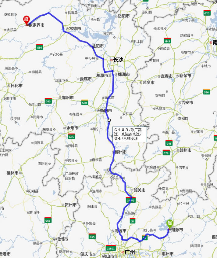 河源去張家界自駕車自助游線路圖全程高速):
