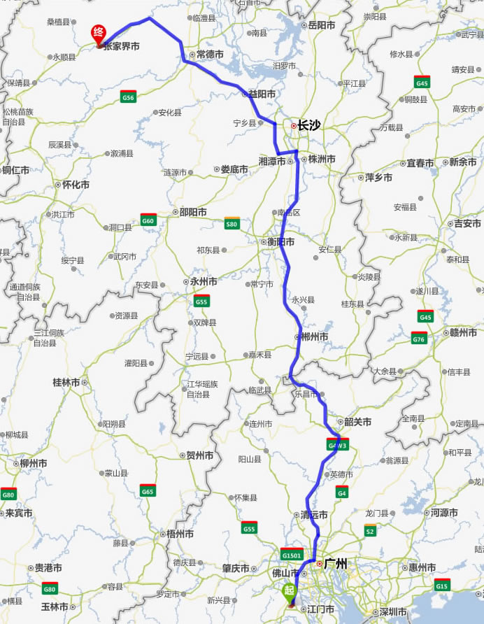 鶴山去張家界自駕車自助游線路圖全程高速):