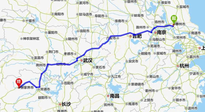 左右,沿途經過泰州——揚州市——滁州市——合肥——六安市——麻城市——仙桃市——潛江市——荊州市——常德市(這里可以不走常德,直接從荊州經澧縣、石門縣到慈利縣)——慈利縣——張家界。