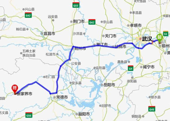 左右,沿途經過黃岡——武漢——仙桃市——潛江市——荊州市——公安縣——澧縣——常德(也可以走國道經澧縣、石門縣)——慈利——張家界。